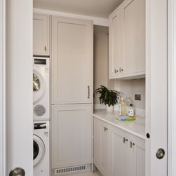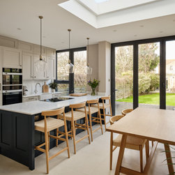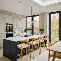 Brass hardware and classic detailing give the kitchen a refined finish, and integrated appliances maintain a clean, uncluttered look. The result is a warm, functional family kitchen that feels both contemporary and rooted in the character of the home.