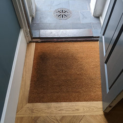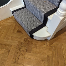 We recommended a single simple-row border all around the expansive parquet to provide a discreet elegant frame. Following the principles of best craftsmanship, we do not cut across door lines with our borders. Instead, our borders are designed to turn around the door frames, ensuring the parquet flows seamlessly throughout the room without interruption. This approach avoids dividing spaces, creating an open and continuous expanse throughout the property. We installed new skirting boards to achieve a close, clean fit against the wooden floor. We did not interrupt the border when it reached the curved bottom step of the staircase. We simply crafted the border to follow the curve to maintain the integrity of the design. The single-row border also extended around the integrated door mat at the entrance. These fitted door mats are a Fin Wood favourite way to protect new wooden floors.