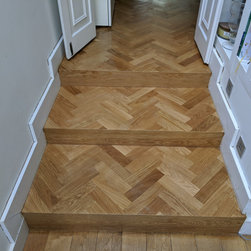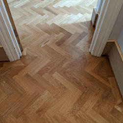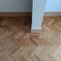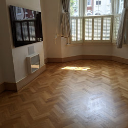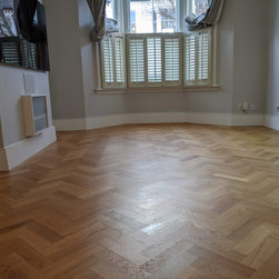 To achieve this impeccably smooth finish, we applied two coats of Osmo Polyx clear satin oil, a high quality German product that we use regularly. The project encompassed fitting a herringbone parquet in the spacious double reception room, a substantial ground floor hallway, and a downstairs toilet.