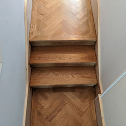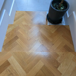 The ground floor features three extended steps leading from the living room to the kitchen extension. The steps were clad with the same herringbone parquet pattern as the main floor, with the risers meticulously crafted from matching oak boards, ensuring a seamless and cohesive design throughout the space.