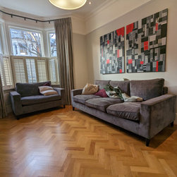 We love herringbone parquet projects, especially ones made all the more elegant with a neat single row border. For this project, the aesthetically minded owners of a large Victorian terrace in Clapham, selected premium grade engineered oak in a classic standard size 20mm thick 70x280. The wood was meticulously sanded, sealed and treated onsite after the installation was completed to ensure an impeccable smooth finish.