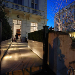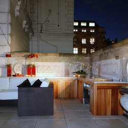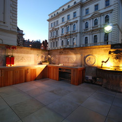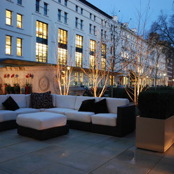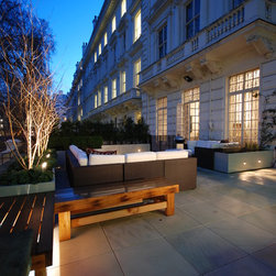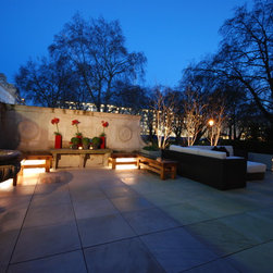 Planting was kept to the minimum for ease of maintenance using large dove-grey planters with three multi stemmed silver birch trees on the boundary bordering the communal gardens, some evergreen screening in front of the trellis and some grasses and square clipped Buxus in the other containers. Lighting was to be major feature as the terrace would be used a great deal at night with the key feature plants uplit, shadow lighting behind the L-shaped cupboard, lighting under the benches and cross lighting from inside the planting containers.