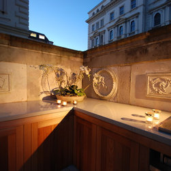 Although the owner was keen to upgrade her terrace and bring a more contemporary look to it, Charlotte Rowe Garden Design advised that anything too contemporary would not sit well with the original features of the terrace and would not be approved for listed building consent. The other challenge in a relatively small space was to create a really good entertaining space with a large amount of seating and space for a large dining table so that large groups of friends and family could be accommodated. The design solution was to create a really elegant terrace with some modern touches such as sofas, and to enclose the more traditional features such as the benches within more contemporary veneer without touching them.