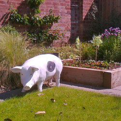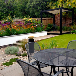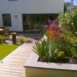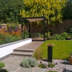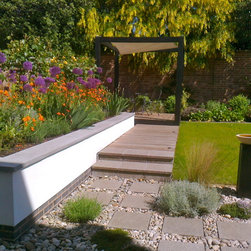 Design for the rear garden of a brand new contemporary syle house. Existing paved patio and gently sloping lawn were retained. A new raised bed was created in rendered blockwork with a custom made polished stone coping. Timber walkway in western red cedar leading to a small decked seating area with sunshade canopy. Custom carved stone birdbath on oak plinth. New planting including wall-trained fruit trees, roses, pernnials and bulbs and a small area for salad vegetables. Exterior lighting scheme.