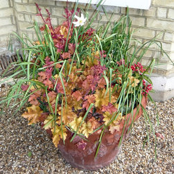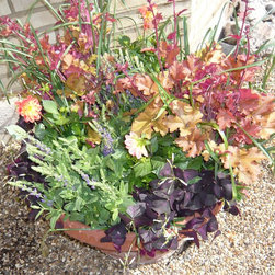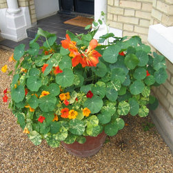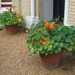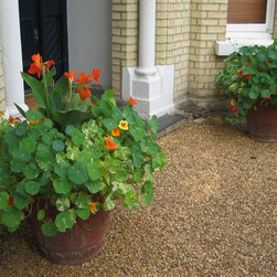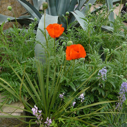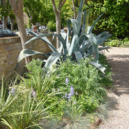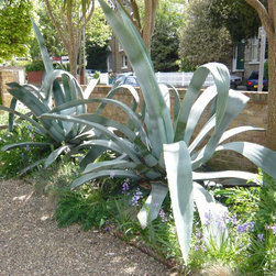 A large front gravel garden using bold plantl such as agaves americana and cordyline australis, festucas and poppies.