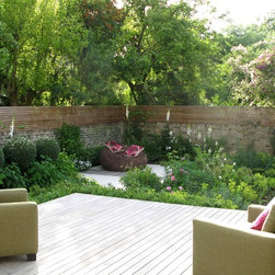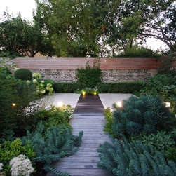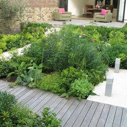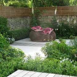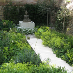 This family garden in Putney, South West London, is surrounded by very attractive traditional gardens but the owner wanted a less traditional garden without a lawn which was elegant and stylish to complement the design of their house. At 8 x 10 metres, the garden was too large to pave everywhere so Charlotte Rowe Garden Design elected to break the space up into two principal seating or dining areas with a path through large beds of rich planting to soften the hard landscaping. The top terrace close to the house has been decked in Ipe and has outdoor sofas and a coffee table; a limestone staircase leads down to a path fringed with Agapanthus, Sedum and Mediterranean planting and on down to a seated Buddha set against yew hedging; a decked path then leads to the main terrace area of limestone; finally a second path leads back through shade-tolerant planting to another yew hedge and to the house.