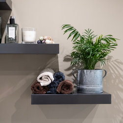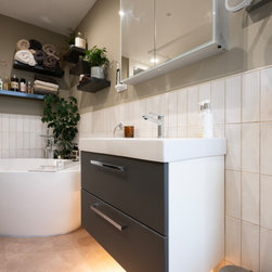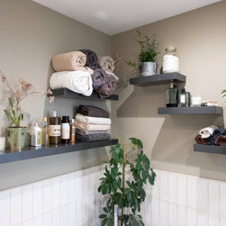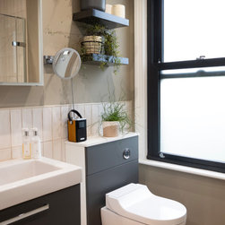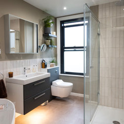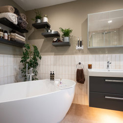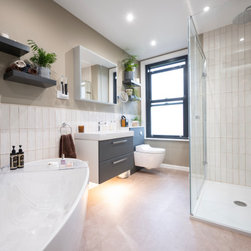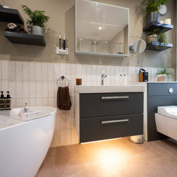 A large bright family bathroom with modular furniture, wall hung Aquaclean WC, freestanding bath, large shower enclosure and decorative shelves.