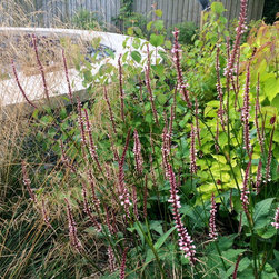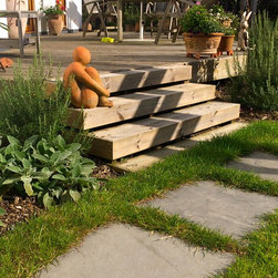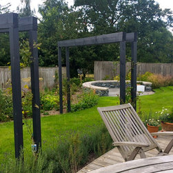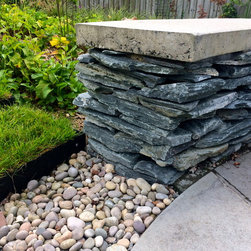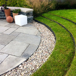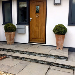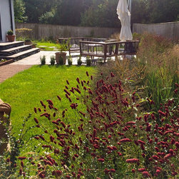 The gardens surrounding this house in rural East Devon had been dominated by disjointed expanses of gravel and paving. The brief was to create a sense of flow around the site and to introduce a much softer feel with generous planting. Much of the existing limestone paving was lifted and re-used to create comfortable steps and intimate seating areas linked by sweeps of grass and naturalistic planting.