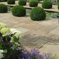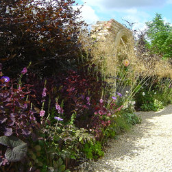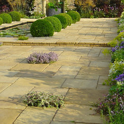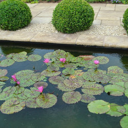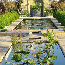Two long formal ponds were built - the upper pond for tender lilies and was heated and the lower for hardy lilies. Buxus flank the upper pond, a lead urn sits at the bank under an arch with a copper beech and herbaceous border to the sides. The paving was chosen to go with the colour of the hand built arch and the side beds were planted with receptive plants to make the eye go down the line making the garden seem even bigger than it was.