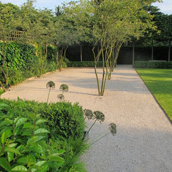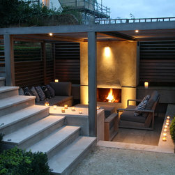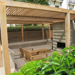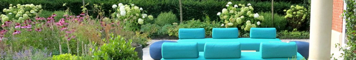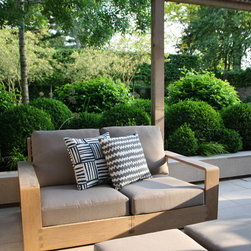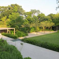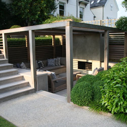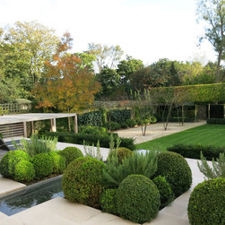 A stylish and classically contemporary garden in Wimbledon. This large garden of 650m² contains particular features requested by the client: fireplace, dining area and petanques court. The planting is structural, using a great deal of 'green architecture' - layered hedging, box pleached trees and 'cloud' planting.