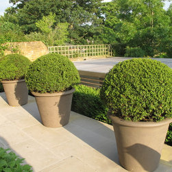 The upper terrace close to the house is of buff coloured English limestone which is cut through by a long water feature surrounded with 'cloud' planting of Buxus sempevirens. The water feature falls over the edge of the terrace down a 1.2m water wall of deep brown polished granite then disappears amongst layers of Yew and Buxus hedging.