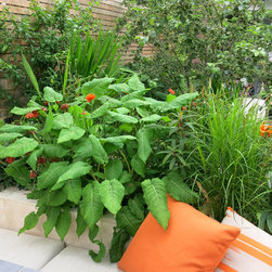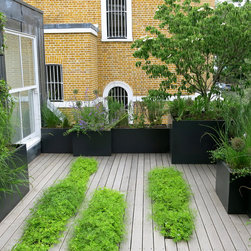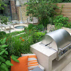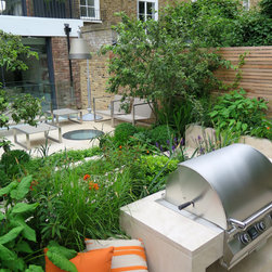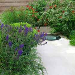 Therefore, Charlotte Rowe Garden Design decided that a series of stone terraces threading their way through wide, abundantly planted beds would not only create a journey through the space and detract from the light wells to some extent, but also give a year-round green view from the house unhindered by dogs and shade. The garden is on two levels with most of the garden leading at the same level from the living room, with steps down to a compact dining area with a built-in BBQ as well as a work shed with a green roof.