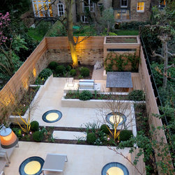 At night, the dramatic up-lighting on the multi-stem Crab Apple trees and the cross lighting on the terraces turn the garden into a sophisticated entertaining space.
