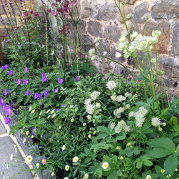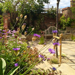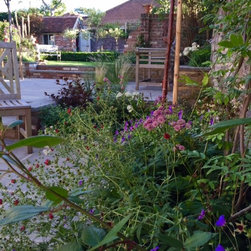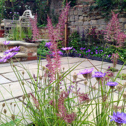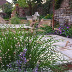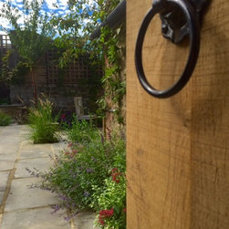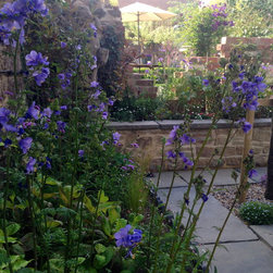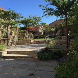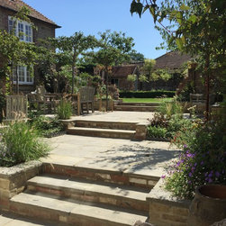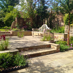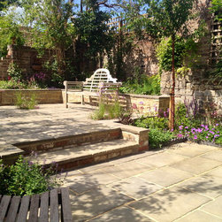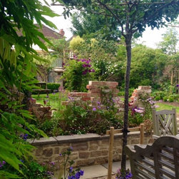 We completely altered the design nd layout, opening up the space to the raised area of lawn, put in new beds and steps and created various seating areas.