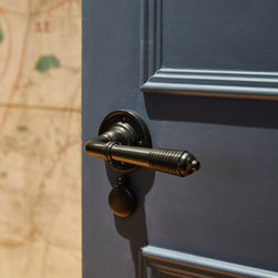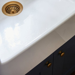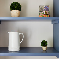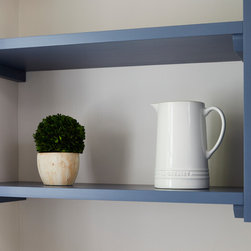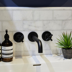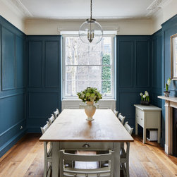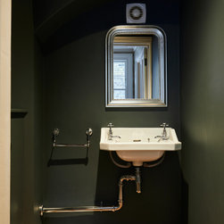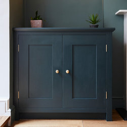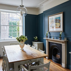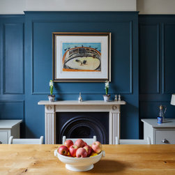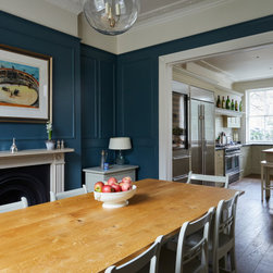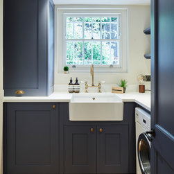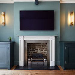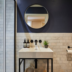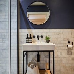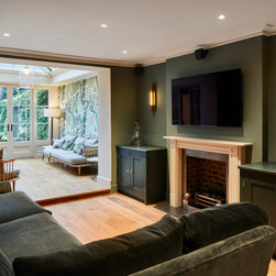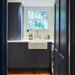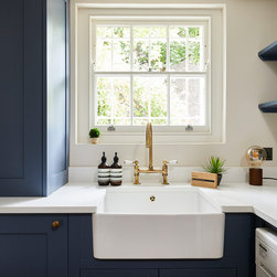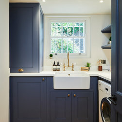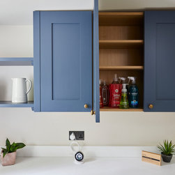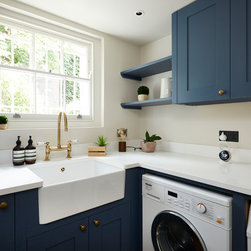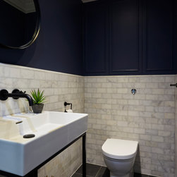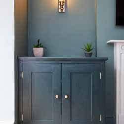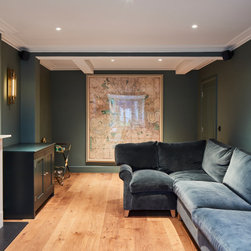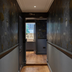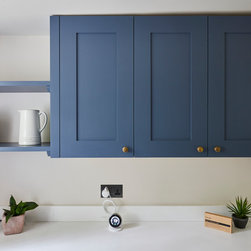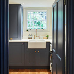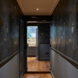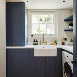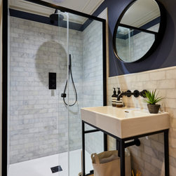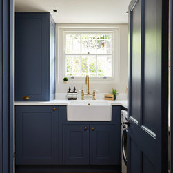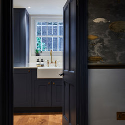 A bespoke utility room was created at the rear to meet the client's exacting specifications. All doors and woodwork made from tulip wood and hand-painted in Mylands 'Mayfair Dark'. A new ensuite shower room installed in the centre of the property, with marble 'metro' style tiles complemented by black brassware.