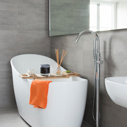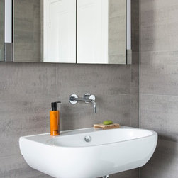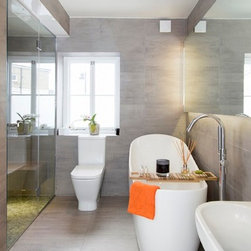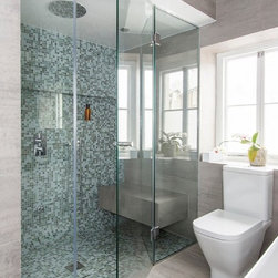 This bathroom makes use of a muted colour palette that allows the brightly coloured mosaics in the shower area to shine. The design is minimal with a splash of colour.