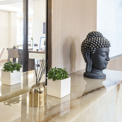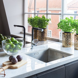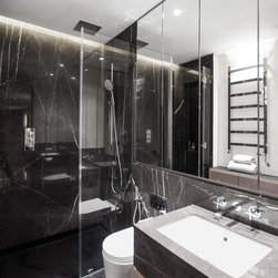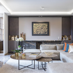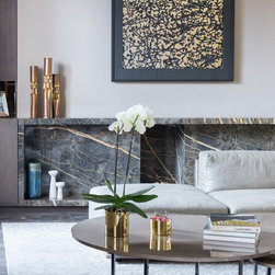 The reconstructed apartment is finished along minimal lines, with extra close attention paid to materials, textures and surfaces. The most prominent element of the re-design is the use of stone. The main living space and hallway are united by the new glass wall and defined by large slabs of Grigio Imperiale marble, while the focal point of the main reception room is a new fireplace, formed from a Port Laurent marble frame. The surrounding oak frame incorporates a built-in fridge and bar, which in turn act as a frame for a specially commissioned graphic artwork by the painter Adam Ball, featuring a collage of gold and black paper. In the kitchen, the countertops are formed from champagne quartz, while thickly veined marble is used in the guest and en-suite bathrooms.