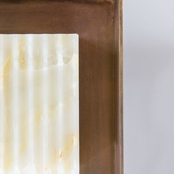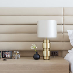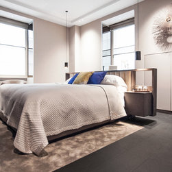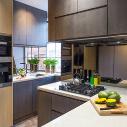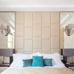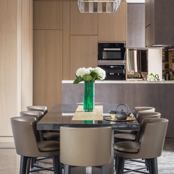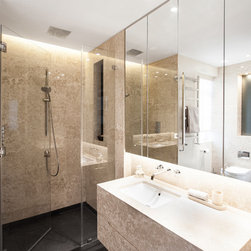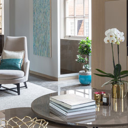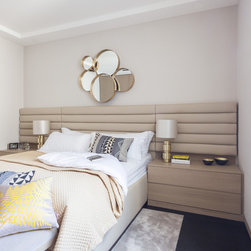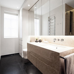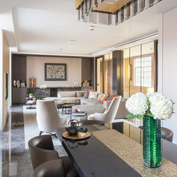 Nick Leith Smith created a full complement of bespoke furniture pieces for the space, including new headboards, consoles and benches in matching oak and leather. A bronze and onyx furniture set - wall lamps, mirror, credenza and console - complete the hallway and living room while the new bespoke kitchen combines oak finishes with etched bronze mirror splash backs. The ensuite bathrooms feature cantilevered vanity units suspended above the floor, clad in thin marble veneer to give an impression of weighty solidity. All doors are full height frameless panels, finished in either light stained grey-white or dark grey-brown oak. Throughout the space, the emphasis is on rich materials and careful detailing, demonstrated by the bronze mirror panels that line the deep window reveals and the use of specially designed bronze and brass ironmongery. Carefully selected furniture is paired with sober, restrained materials, including a coffee table by Fendi and an Armani dining table. The overall effect is one of calm simplicity, creating an urban retreat that mixes the refined functionalism of a high-end hotel with the personal touch.