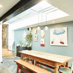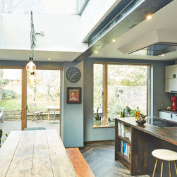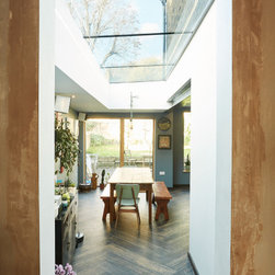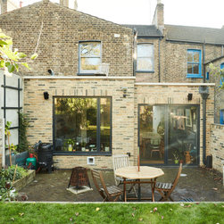 Due to the curve in the street, the property was splayed with the rear somewhat wider than the front, resulting in the new side infill extension benefitting from an interesting form in plan. A large bespoke rooflight was created to bring as much light as deep into the plan as possible, and form a bright and exciting transition down form the existing rear reception. The side-infill extension was also stepped below and back from the new rear extension in order to create a subordinate volume, whilst matching materials and detailing were used to tie the two volumes together as a single element.