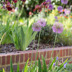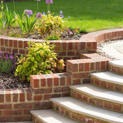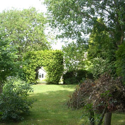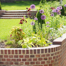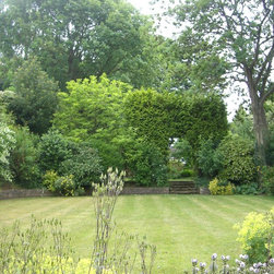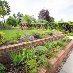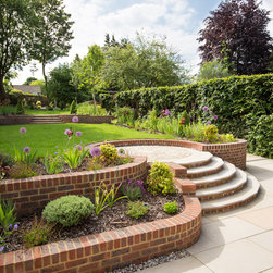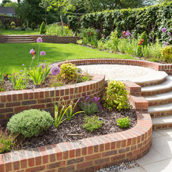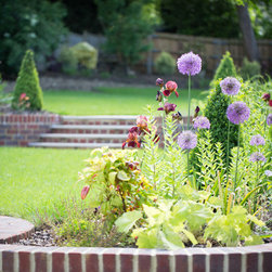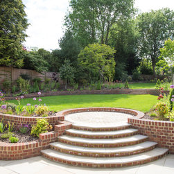 This large, neglected back garden was full of tired, overgrown shrubs and weeds. Some of the trees and hedges were removed to create more light, and the garden opened up. A generous patio was built outside the house, and the side path to a new shed widened. Two sets of circular steps link to the different levels of the garden, whilst attractive brick walls create different terraced beds that have been planted to provide colour and interest throughout the year. The rear half of the garden has slightly less formal planting, and we are in the process of creating an area of wild flowers and bulbs to reinforce this.