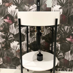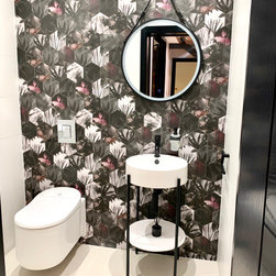This was part of a bigger refurbishment project. The cloakroom was a small space but we wanted to create huge impact. We sourced these beautiful floral hexagonal tiles to create a feature wall. We found this beautiful sink in frame and accessorised to match.