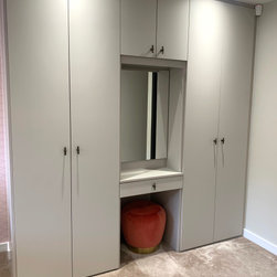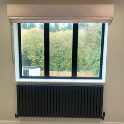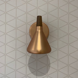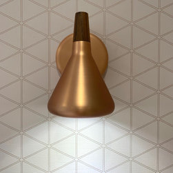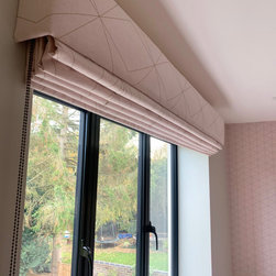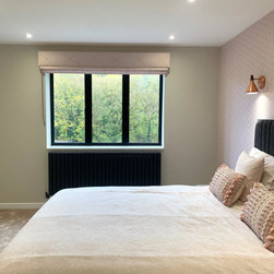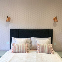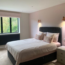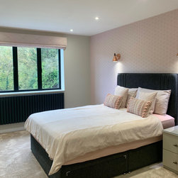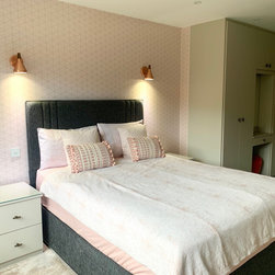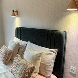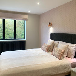 This was part of a bigger refurbishment project. We created a feature wall using geometric wallpaper and sourced this beautiful fabric for cushions and blinds to create accents to the room. We added these beautiful wall lights to compliment the copper in the wallpaper.