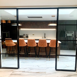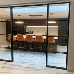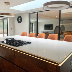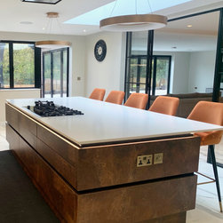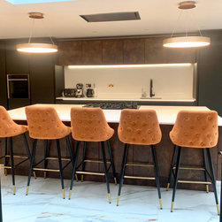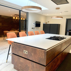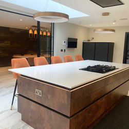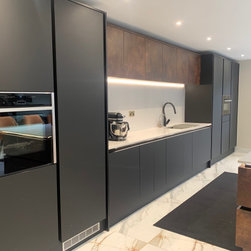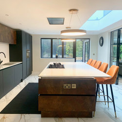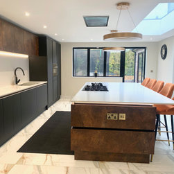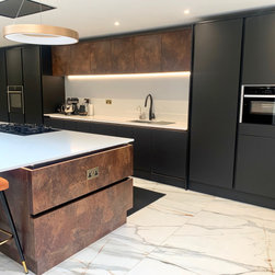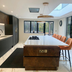 This kitchen was part of a larger refurbishment project. The clients wanted something striking and dramatic. We chose a wall of black kitchen units with accent colour wall units coupled with a large island in the centre of the kitchen in a complimentary accent colour. We added these beautiful...