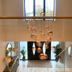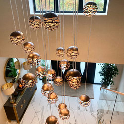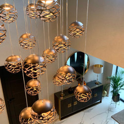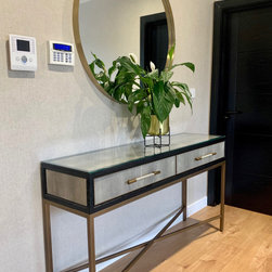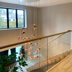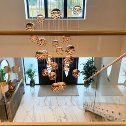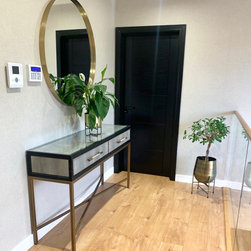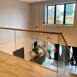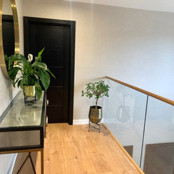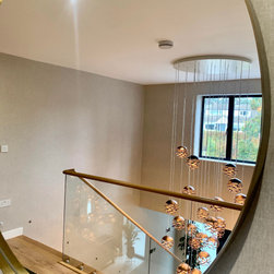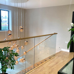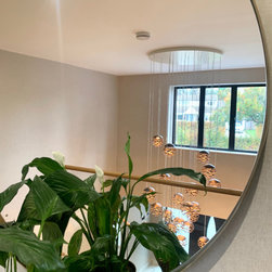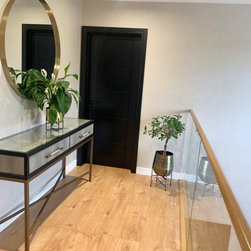 This landing was part of a larger refurbishment project. We wanted to create a huge impact as you enter the home. The stunning central chandelier was the focal point of this space and the glass balustrades allowed the space to feel seamless. We fully wallpapered the walls.