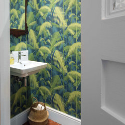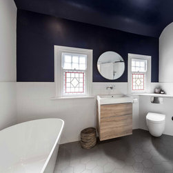 The bathroom areas are also refinished, with the WC offering a pop of leafy wallpaper print, and the main family bathroom a dark navy wall and ceiling colour contrasting with lighter floor and wall tones.