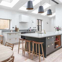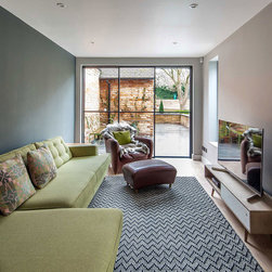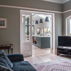 A snug replaces the previous kitchen and dining area, and creates a niche opening into the extension area of a light filled open-plan kitchen/diner. We designed all of the internal joinery and doors to create a contemporary take on the Victorian style.