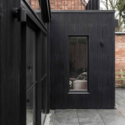 As a key feature to the exterior, the charred black timber clad provides a unique and hardwearing character to the form, with black aluminium crittal windows, a black zinc roof, and flat profile frameless rooflights, shaping the natural light entering the new and renewed spaces. To the landscape, blue limestone slabs offer tonal variation from the darkness of the cladding frame, and create a natural level threshold crossing out to the exterior.