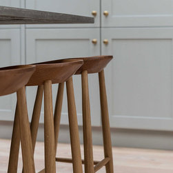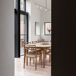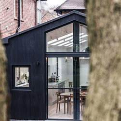 Internally, to the extension the main steel structures are exposed and painted black to compliment the glazing frames and exterior cladding tones. The main contrast with the darkened exterior tones is then set with lighter kitchen cabinetry and walls, with a warm lyesoap finish to douglas fir floorboards throughout. The countertop surface is then contrasted with a polished concrete worktop, another tonally natural material offset between the lighter surfaces and the darker exterior lines.
