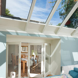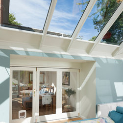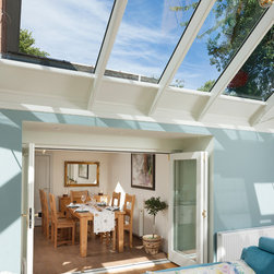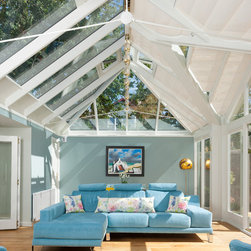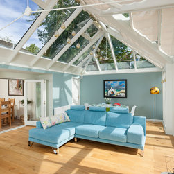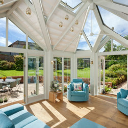 A stunning hipped roof bespoke timber conservatory with projecting peaks on two elevations. Designed and installed by Mozolowski & Murray. Bifolding doors connect the house to the new conservatory. Finished externally in Dusty Grey and White internal. Soft blue walls completed with a blue corner sofa suite make this a tranquil space to relax in.