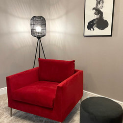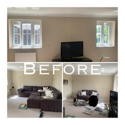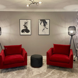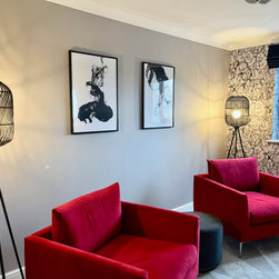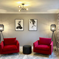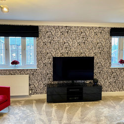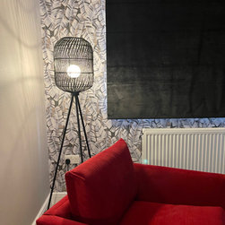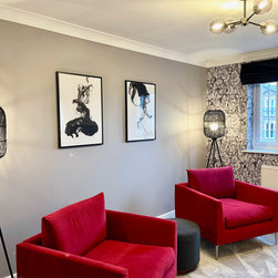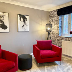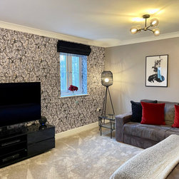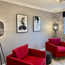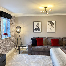 The clients wanted a makeover of their living room. As it was, it remained unused. They wanted to keep the existing large corner modular sofa. We used this as a starting point for the colour scheme. We fully wallpapered the walls and added gorgeous leaf wallpaper feature wall with metallic hints. We brought in statement accent chairs in a beautiful red, the clients favourite colour. We added beautiful pendants and floor lamps and the result was a room which they absolutely love and spend evenings as a family!