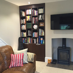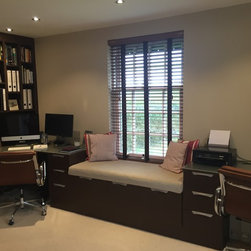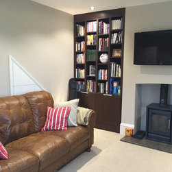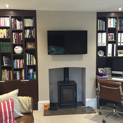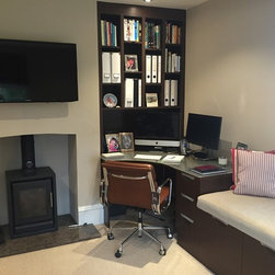 Home Office & Library Project Complete- This client worked from home and wanted a complete overhaul of her study. The brief was to make it more functional with plenty of storage and to create a 'Ralph Lauren' aesthetic, mixing dark woods with tan leather and accent soft furnishing. We created aysmmetric bookshelves either side of the fireplace, added a wood burner and a double desk bridged by a gorgeous window seat to make the most of the views! Here are the results.
