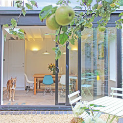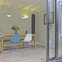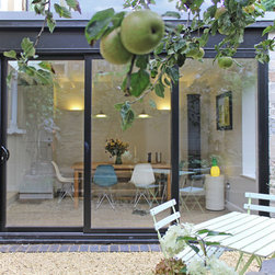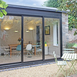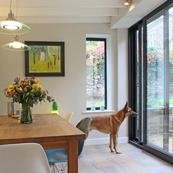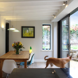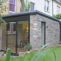 Originally featuring a rear reception and a separate galley kitchen, this ground floor maisonette in Redland did not make the most of its enclosed private space. The project creates a new dining room in the garden to add space and connect the living areas with the outdoors via generous sliding doors and a new gravel patio. The extension's height was constrained by the existing boundary wall; the roof rafters are left exposed to increase the internal height and create a feature. Externally the extension is a simple, clean volume clad in natural stone to reflect the prevalent character of the neighbourhood.