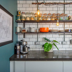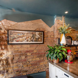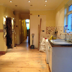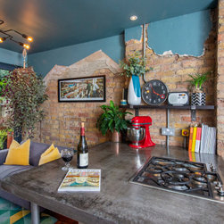 The new bifold doors flood this room with light and in the summer allow the owners to blur the boundary between inside and out. A new kitchen layout with its poured concrete counter tops has given oodles of workspace, and the addition of the steel pipe with hanging exposed lights, scaffold board shelves, surface mounted sockets and exposed brickwork gives a modern industrial feel to this space.