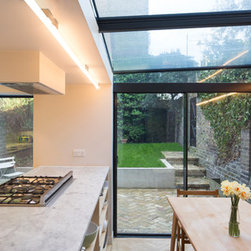 The principles of the development were to reconfigure the existing duplex maisonette to maximise its connection with the south west facing rear garden and reconfigure the living accommodation across the ground floor. A new glazed infill extension has been added which runs through into the existing 70's rear extension, together with new structurally adhered frameless glazed windows to the existing 70's extension. By focussing the extensive structural alterations to the 70's extension we were able to fundamentally reorganise the property whilst working within the strict restrictions associated with a Grade II listed property.