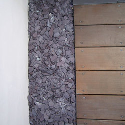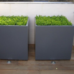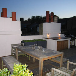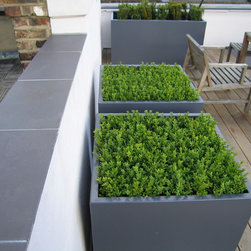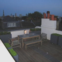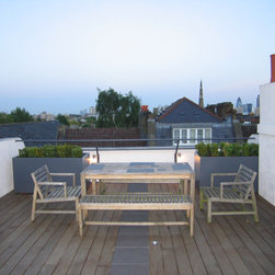 The design process: A decking area with slate detailing on the surface and around the garden. Large metal planters were specially designed for the garden and planted with Buxus sempervirens to keep the view of London Skyline