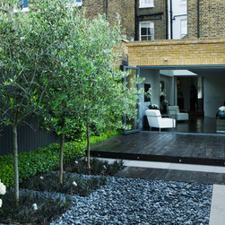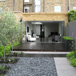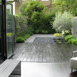 The owner of this Fulham house is a fashion designer and after some years in the house, she decided to overhaul and update the house with a major refurbishment. The style of the interior was to be minimalist with a colour theme of black/dark grey and deep walnut, using glass, basalt and timber to achieve this. She was keen to continue this theme into the 13m x 5m garden. The layout of the house was to be unusual with the main sitting room at the rear of the house, leading to the garden, so it was crucial that the look continued out into the garden.