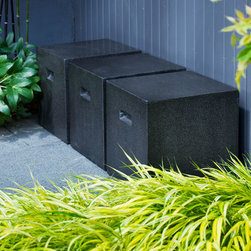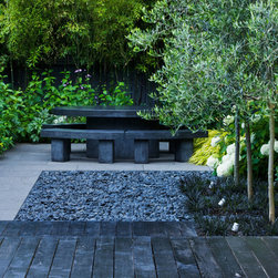 Charlotte Rowe Garden Design decided to use a combination of dark coloured materials in the garden to achieve the effect: dark stained oak decking leading to dark grey/black granite, with black polished pebbles, as well as bespoke fencing in darkest grey.