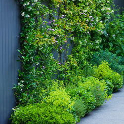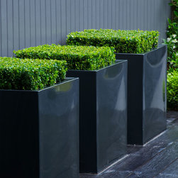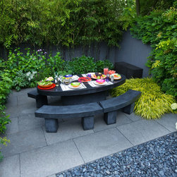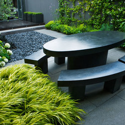 The colour palette for planting was to be black, purple, with some limey green/cream. A strictly limited palette of plants were used to achieve this: Ophiopogon planiscapus 'Nigrescens' and Phyllostachys nigra for the black colour and structure was provided with clear-stemmed olive trees, Pittosporum tobira 'Nanum' and Cornus sericea 'Flaviramea'. Trachelospermum jasminoides was planted along the boundary fences and purple perennials such as Angelica gigas, Salvia nemorosa and bulbs such as Tulipa 'Queen of the Night' and Allium 'Purple Sensation' to provide the purple colour.