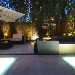 The planting is mixed shrubs and perennials with climbers up the side trellis. There is lighting within the skylights in the ground to create glow and to provide more lighting to the basement room as well as up-lighting for the trellis.