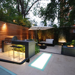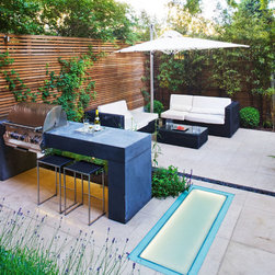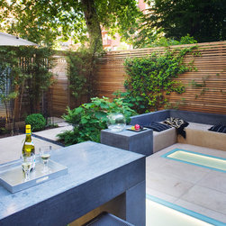 Within the garden itself, two seating areas have been created, one made of the same stone as the paving and a darker polished concrete and the other with outdoor sofas and chairs. There is also a stainless steel BBQ built into a hand-made polished concrete counter.