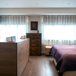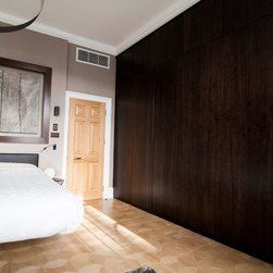 Enviable floor to ceiling wardrobes in deep, warm tones in this lovely Baker Street bedroom
