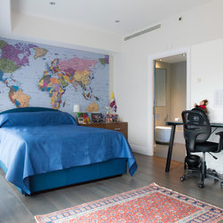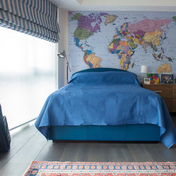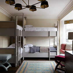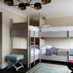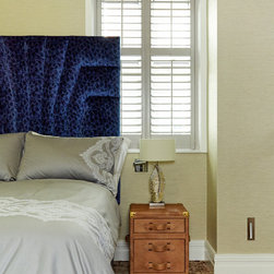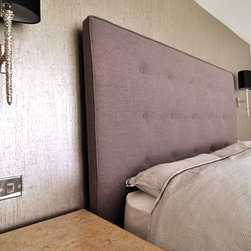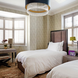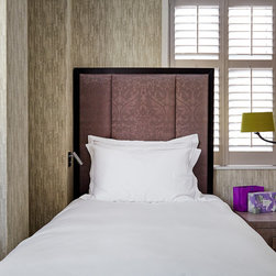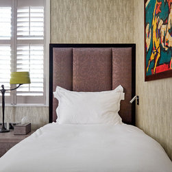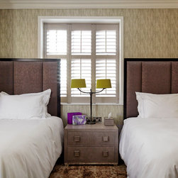 A sophisticated twin room in a family flat in Knightsbridge with headboards from Alter London