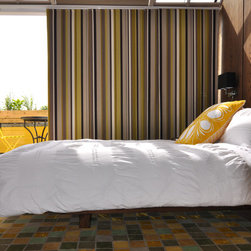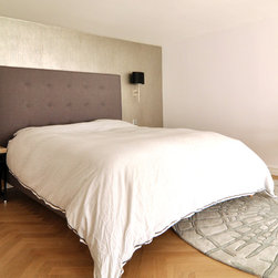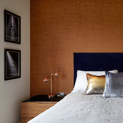 A textured guest room, with West Elm metallic bedding and copper detailing