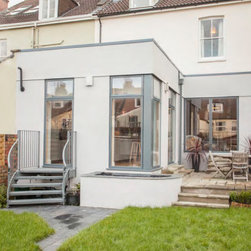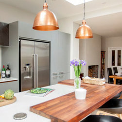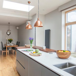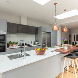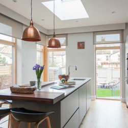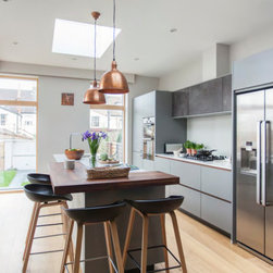 A dark and narrow kitchen extension has been replaced with a wider extension incorporating several full height windows. An island forms the central part of this stylish kitchen which combines industrial chic, retro and high quality neutral design elements. A roof light and lantern provide additional natural light.