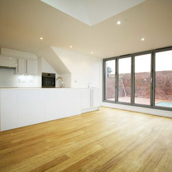 Solid Natural Strand Woven Bamboo Flooring was used to create this open plan kitchen. It is extremely durable (twice as hard as Oak) so will stand the test of time on is a heavily used space.. This particular flooring is also a sustainable flooring material and has been certified FSC 100%.