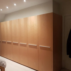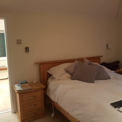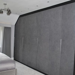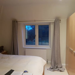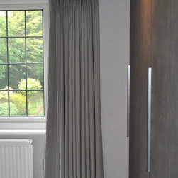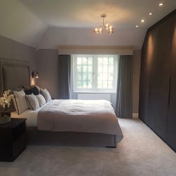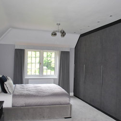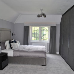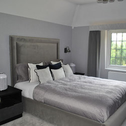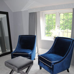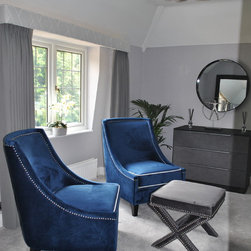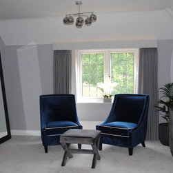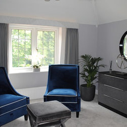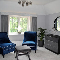 This client enlisted our services to create a soft but masculine scheme for the master bedroom of his bachelor pad. We added lots of beautiful fabrics and patterns in a grey palette, with a dramatic burst of marine blue in the armchairs. We opted for fully wallpapered walls to give another layer of texture.We created fully upholstered wardrobes in a grey sued with a television housed centrally so he could lounge in bed watching his favourite shows. The room felt like a sea of calm and tranquility